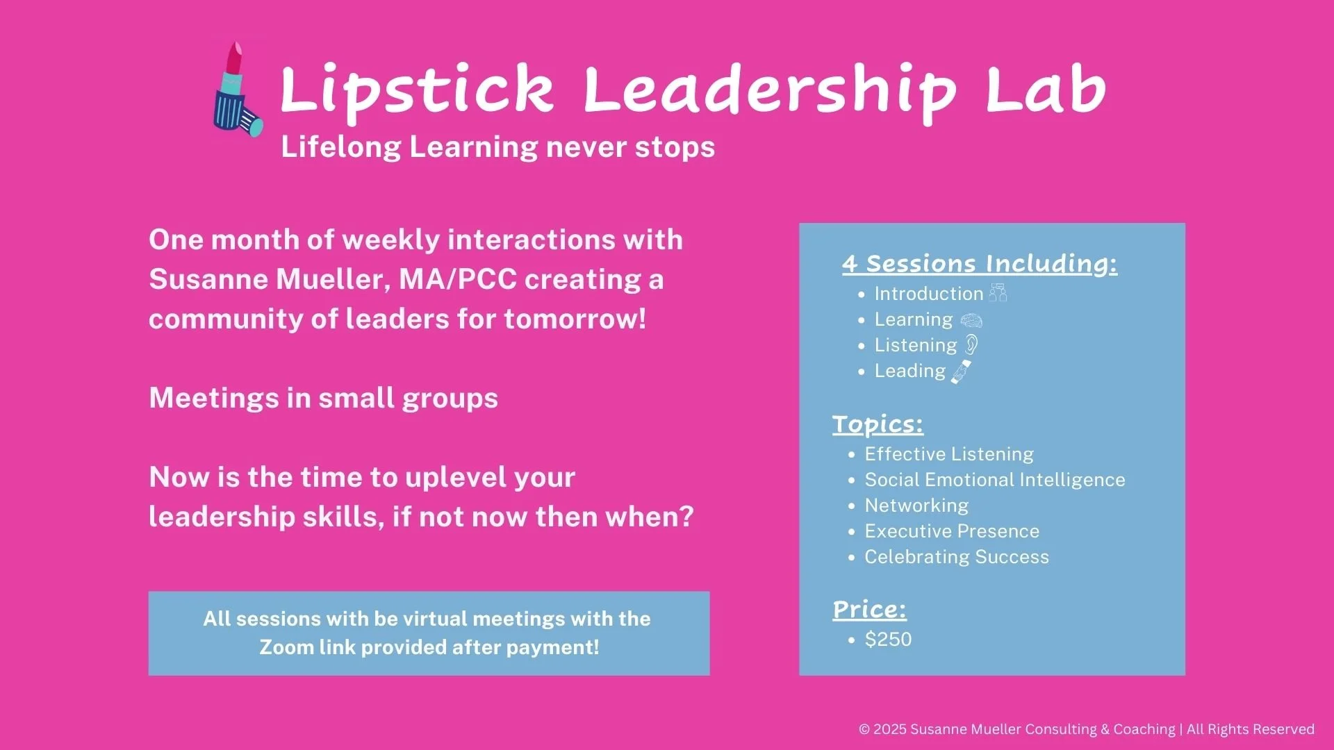 One month of weekly interactions with Susanne Mueller, MA/PCC creating a community of leaders for tomorrow! Meetings in small groups. Now is the time to uplevel your leadership skills, if not now then when?